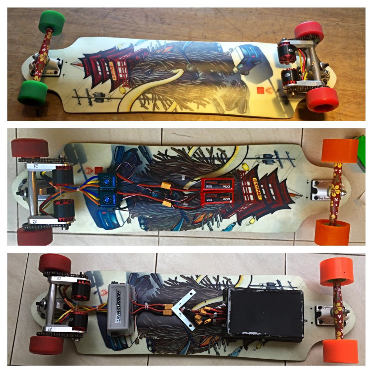 Longboard Electric gue kelar sudah.. Dari atas, versi BETA. Bawah, versi penyempurnaan, pake Tupperware. 😂👍🏻
