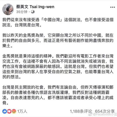 蔡的声明写得太好了。有几点特别欣赏:1,从来没接受过中国台湾说法。2,自由与多元是艺术奔放的乐土。3,反对网上霸凌,自由表达者不应被霸凌或承受心理威胁。
